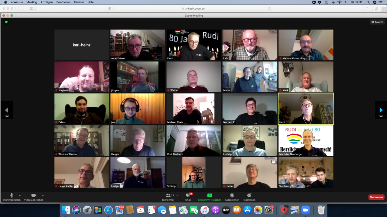 That's right. But when a founding member reaches his 80th birthday, that's also a reason to celebrate. Instead of handshakes and hugs, there were "only" personal wishes, poems and video greetings from many long-time friends during a Zoom session, but even these were heartfelt pleasures for the celebratee. Because Rudi Kalka is still actively involved as a bass singer, the preparations for a birthday serenade had to be done in secret. But the joy was all the greater when the Polecat song with individual lyrics could then be performed - assembled from 37 individual recordings of almost all current chorus members.