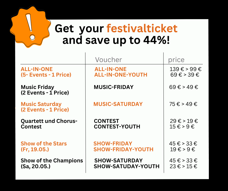 Experience the German championships for Barbershop choruses and Barbershop quartets or let yourself be carried away in the evening gala shows on Friday and Saturday. Exhilarating performances and the 4-part a cappella sound of barbershop harmony singing are waiting for you.