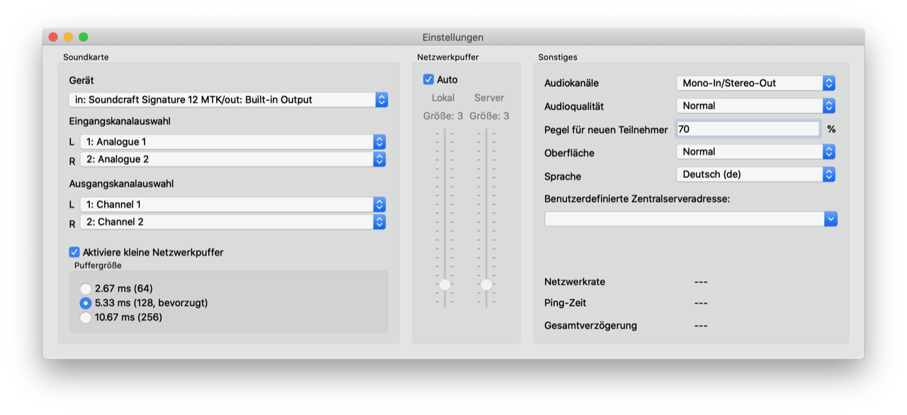 Bevor die Verbindung zu einem Jamulus-Server aufgenommen wird, muss das Eingabegerät (Mikrofon) und das Ausgabegerät (Kopfhörer) ausgewählt und dessen Lautstärke eingestellt sein. Die Auswahl geschieht über das Einstellungsfenster durch Betätigen der entsprechenden Taste.