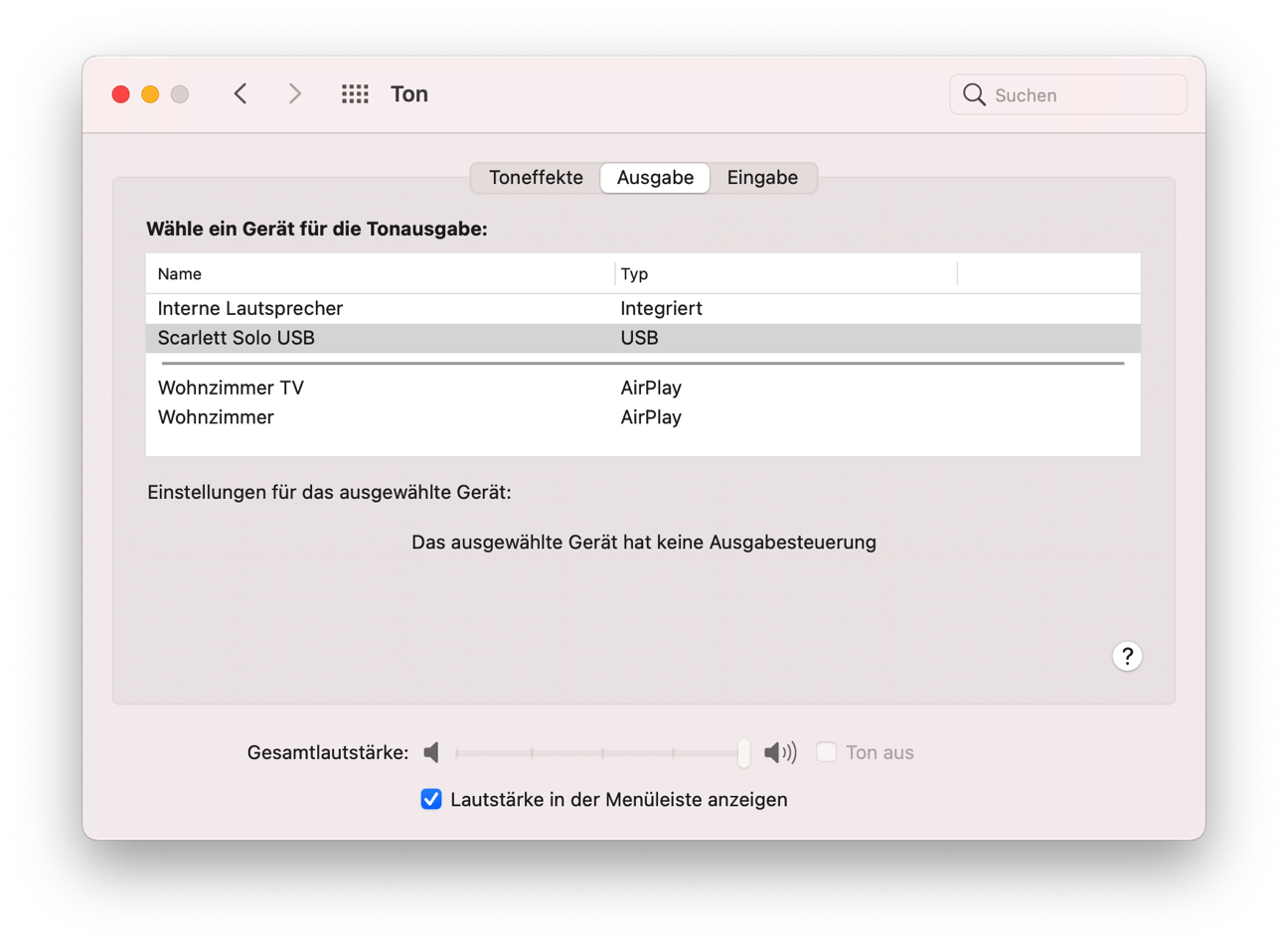 Auf Mac-Systemen ist die Einstellung denkbar einfach: Es wird ein Ein- und ein Ausgabegerät ausgewählt, dessen Lautstärke über die Menüleiste geregelt werden kann.