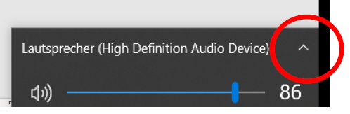 Links-Klick auf das oben markierte Dreieck öffnet eine Auswahl von Audiogeräten. Für jedes kann die Lautstärke separat eingestellt werden. Ein Links-Klick auf das Lautsprechersymbol des jeweils augewählten Gerätes schaltet dieses stumm.