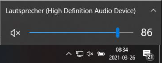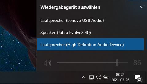 Abhilfe ist zu schaffen, indem der eingebaute Lautsprecher stummgeschaltet wird. Übrigens: Wenn man über sein Headset nichts hört, kann man auf dieselbe Weise schauen, ob der Kopfhörer/das Headset „stumm“ geschaltet ist. Ein Links-Klick auf das Lautsprechersymbol unten rechts in der Taskleiste (ggf. im Bereich der ausgeblendeten Symbole) zeigt das aktive Audiogerät und dessen Lautstärke, im Bild 86%.