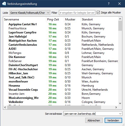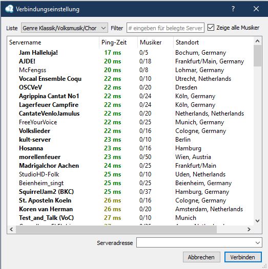 - Server durch fremde Nutzer eher in ähnlichen Zusammenhängen genutzt werden, die sich über die Auswahl einer Liste im oberen Fensterbereich - hier: Genre Klassik/Volksmusik/Chor festlegen lassen, damit man weitgehend ähnliche Interessen hat;